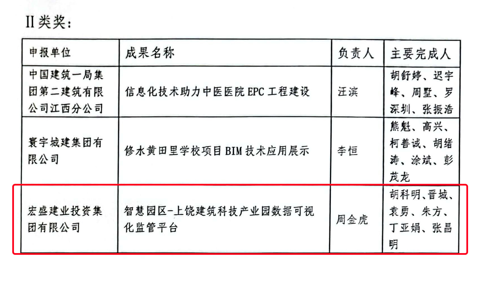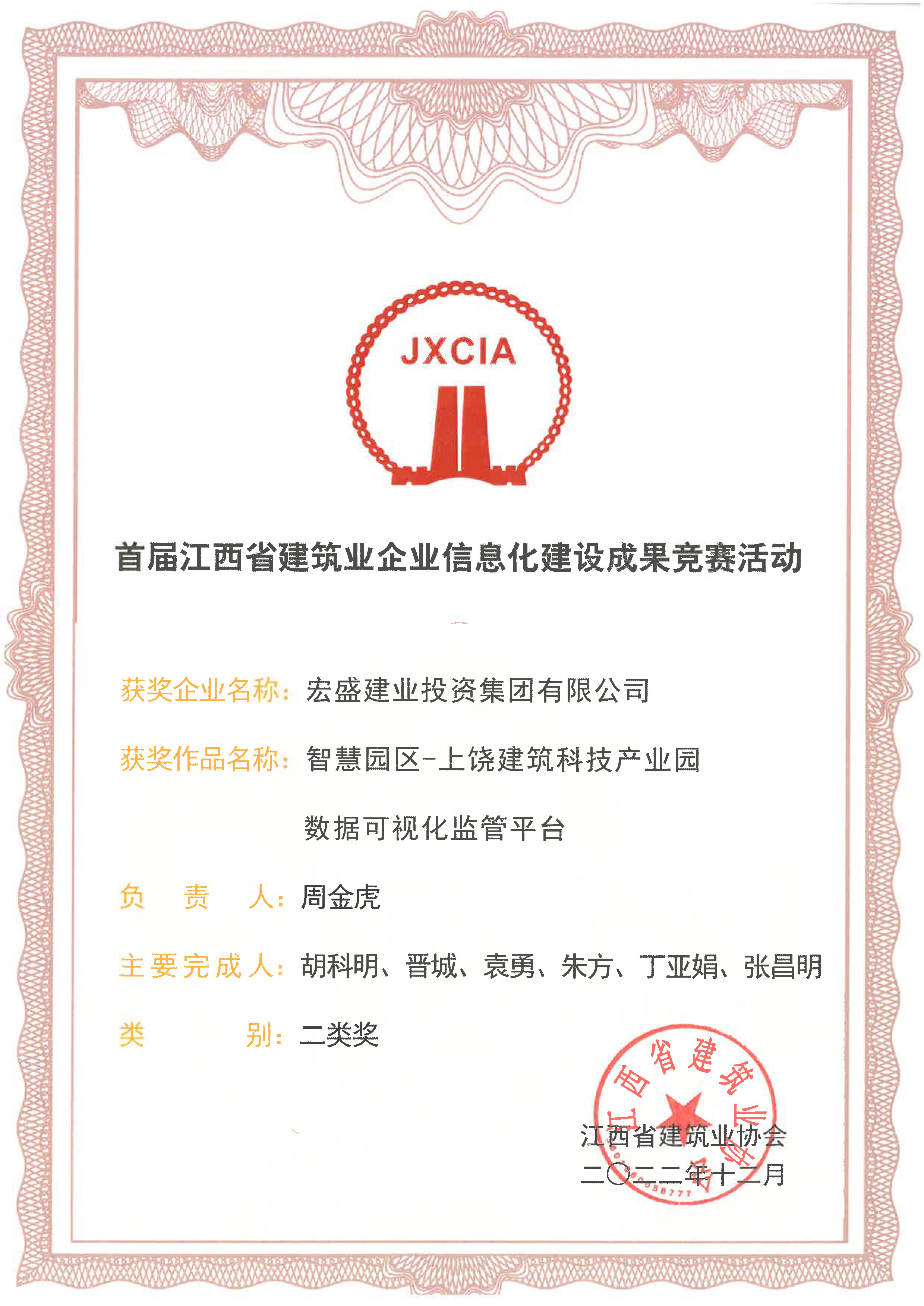 宏盛建業(yè)參賽作品《智慧園區(qū)-上饒建筑科技產(chǎn)業(yè)園數(shù)據(jù)可視化監(jiān)管平臺》獲項(xiàng)目級二類獎(jiǎng),并獲江西省建筑業(yè)企業(yè)信息化建設(shè)成果優(yōu)秀企業(yè)稱號。