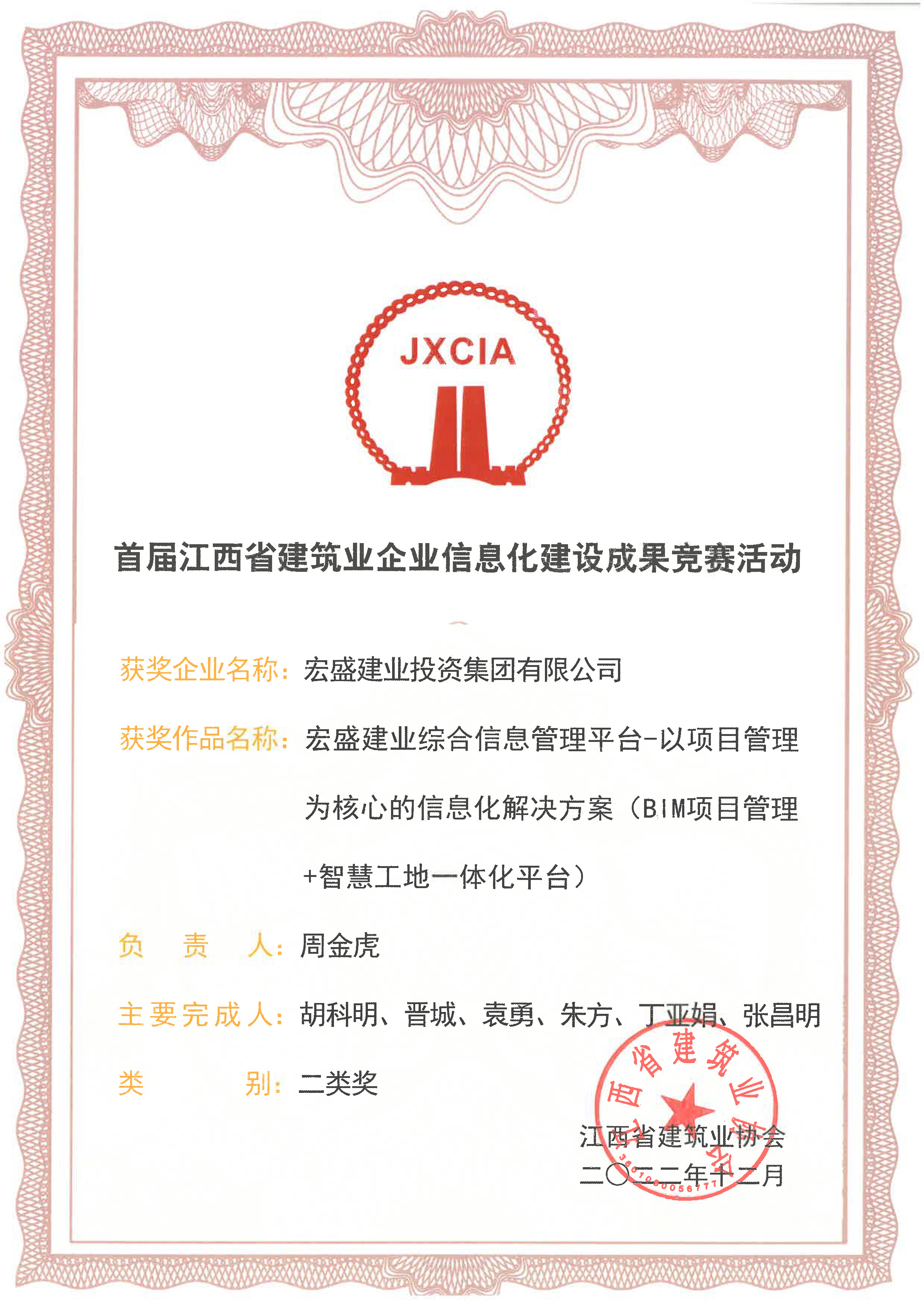 宏盛建業(yè)參賽作品《宏盛建業(yè)綜合信息管理平臺-以項(xiàng)目管理為核心的信息化解決方案(BIM項(xiàng)目管理+智慧工地一體化平臺)》獲企業(yè)級二類獎(jiǎng),并獲江西省建筑業(yè)企業(yè)信息化建設(shè)成果優(yōu)秀企業(yè)稱號。
