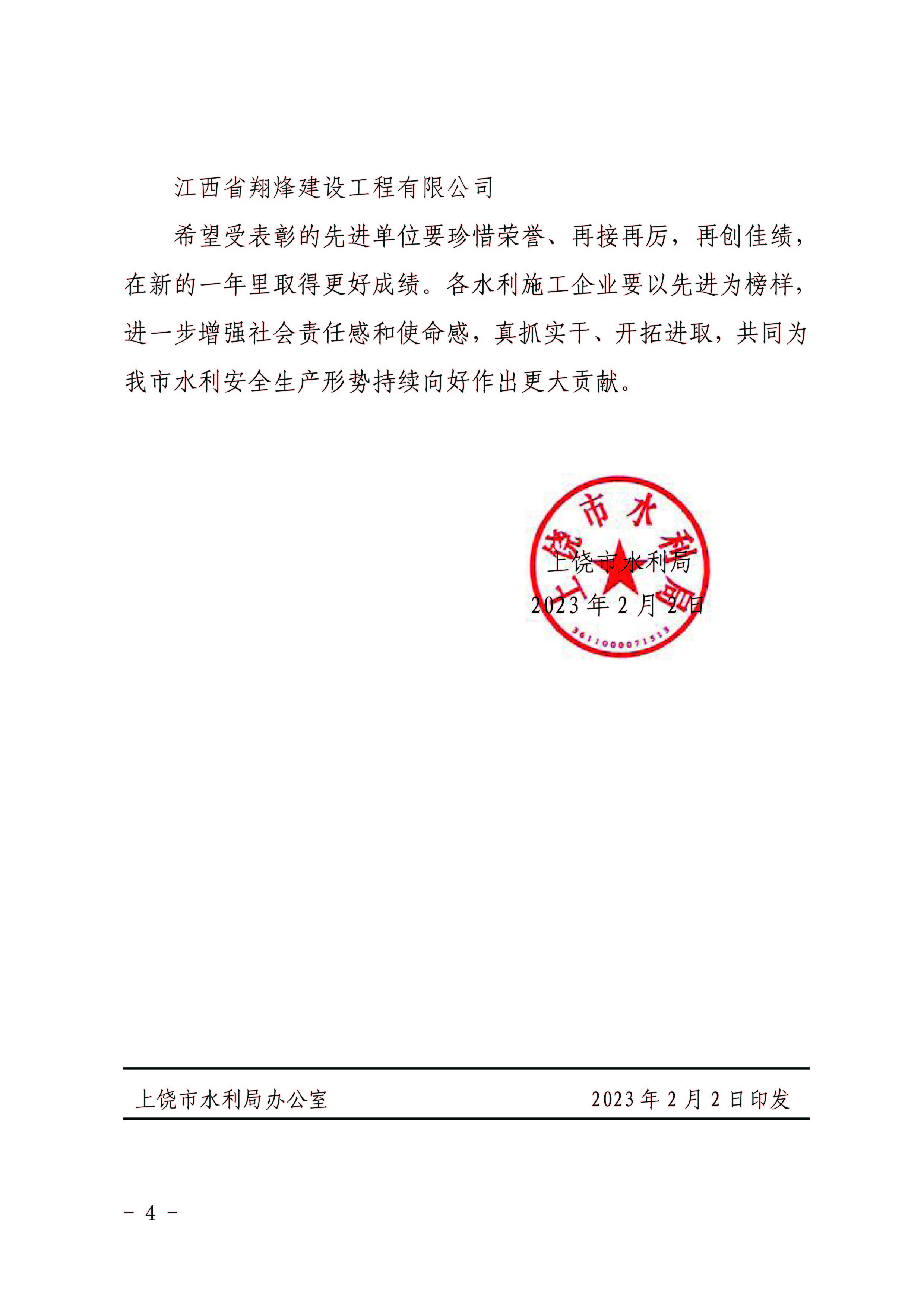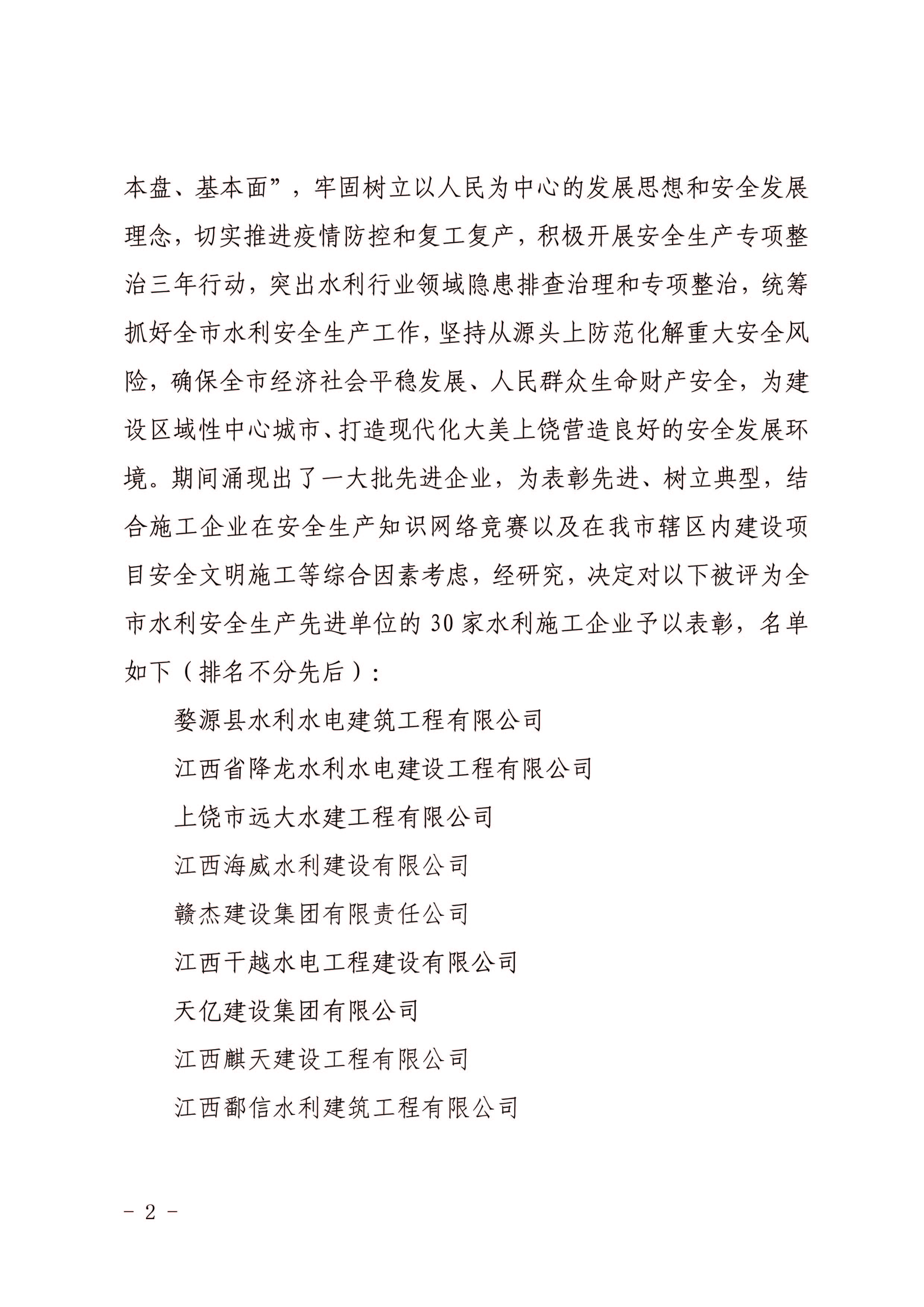 近日,上饒市水利局饒水監(jiān)督字〔2023〕1號(hào)中公布了關(guān)于表彰2022年度上饒市水利施工企業(yè)安全生產(chǎn)先進(jìn)單位的通報(bào)。我集團(tuán)憑借切實(shí)加強(qiáng)安全生產(chǎn)管理,明確安全生產(chǎn)責(zé)任,筑牢安全生產(chǎn)“三道線”的原則,獲評(píng)為2022年度上饒市水利施工企業(yè)安全生產(chǎn)先進(jìn)單位。