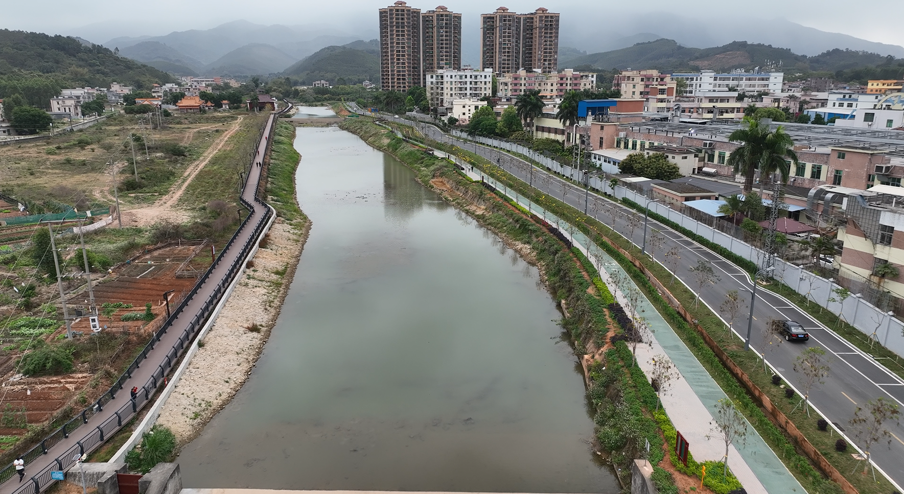 該項目于2022年6月20日開工,項目建安總投資約:7358.8萬元,建設項目主要工程有:道路工程,給排水工程,徐田段濱水生態(tài)休閑帶(新建棧道)工程,沿街立面改造工程,綠化工程,照明及安防工程,黨建工程;建設內容為徐田段濱水生態(tài)休閑帶工程(其中鋼結構生態(tài)板棧道面積為7320㎡;棧道兩側風貌提升面積為16500㎡);沿街立面工程(其中建筑外立面清理面積為36094㎡,沿線住宅門前地面鋪裝面積為12500㎡,人行通道地面鋪裝面積為5650㎡);道路工程(其中新建水泥路面瀝青罩面面積為16500㎡,現(xiàn)狀水泥路面瀝青罩面面積為35098㎡,路面硬化面積為12333㎡。坳嶺段沿河搶險連接道路面積為9765㎡);黨建工程(宣傳欄20組);照明工程(路燈照明351個);安防工程(鋪設線路面積61363 ㎡);防護工程(防護欄6245m )等配套設施建設。