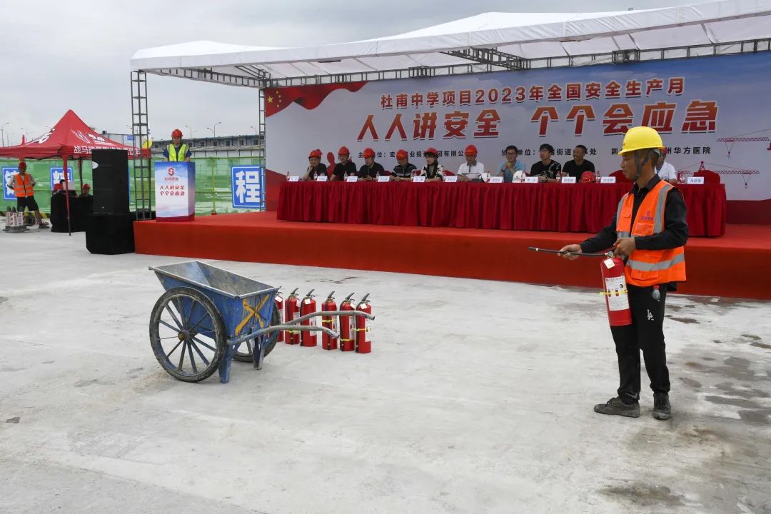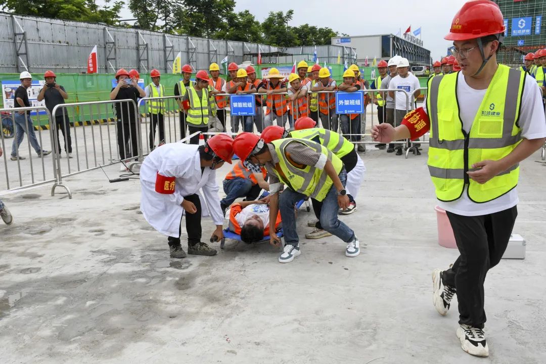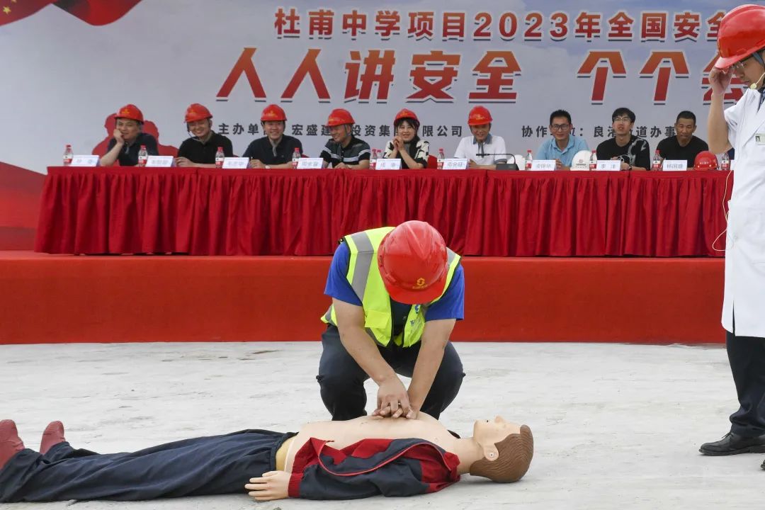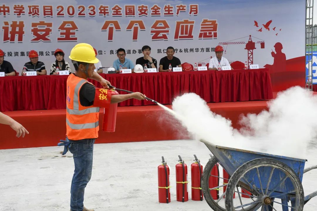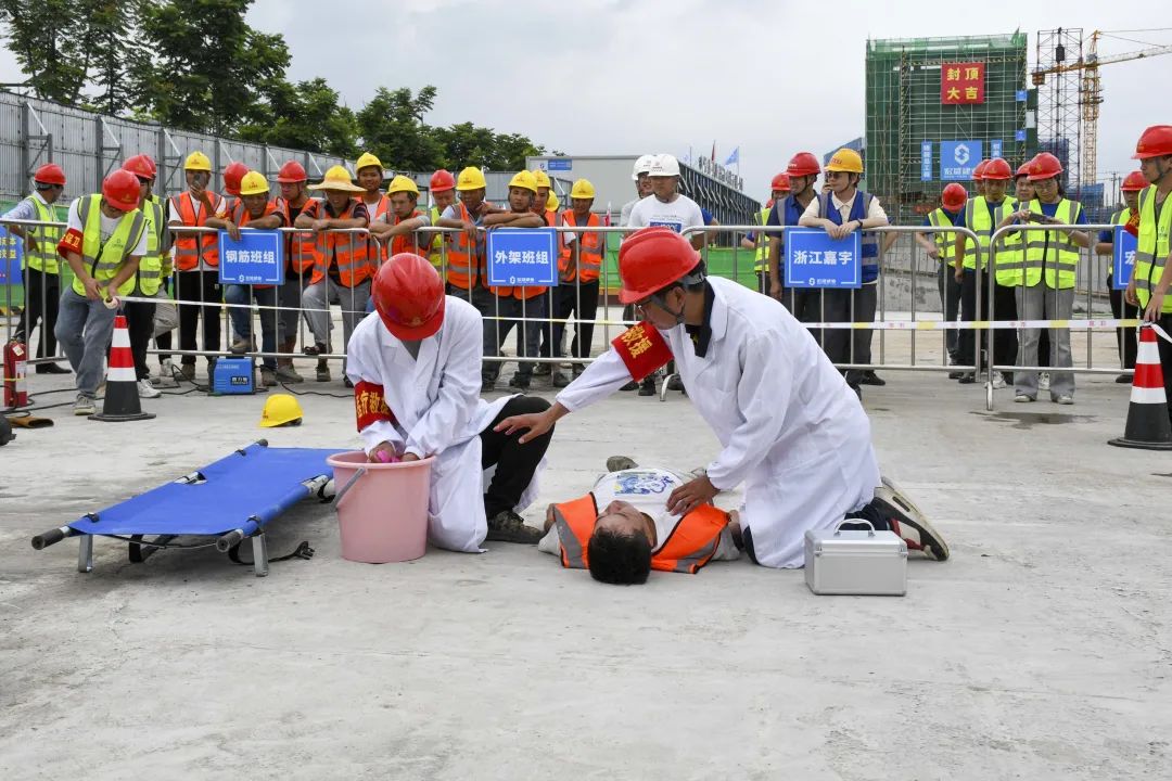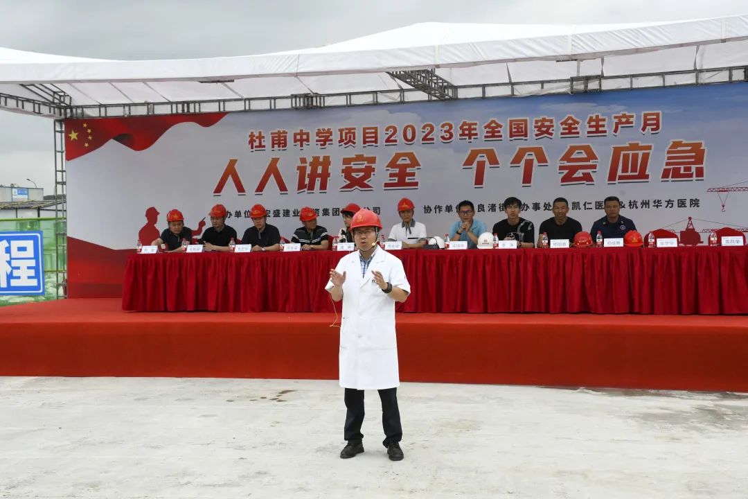 時值夏季,持續(xù)的高溫天氣給奮戰(zhàn)在一線的建筑工人帶來嚴峻考驗。為確保杜甫中學項目的安全生產工作順利開展,進一步提升全員應對突發(fā)事故的應變能力,6月20日,杜甫中學項目舉行事故應急救援演練,杭州良渚新城城建投資有限公司項目負責人凌錦華、杭州城投良渚新城開發(fā)有限公司項目負責人李洋、浙江嘉宇工程管理有限公司總監(jiān)理工程師楊國盛、良渚區(qū)域微型消防站站長鄧成勇、杭州華方醫(yī)院院長、主任醫(yī)師吳學華出席演練活動,集團副董事長、總裁周金旺,監(jiān)事長、審計中心總經(jīng)理成承等核心高管代表一同出席,各參會代表與項目各方代表一同列隊參加。