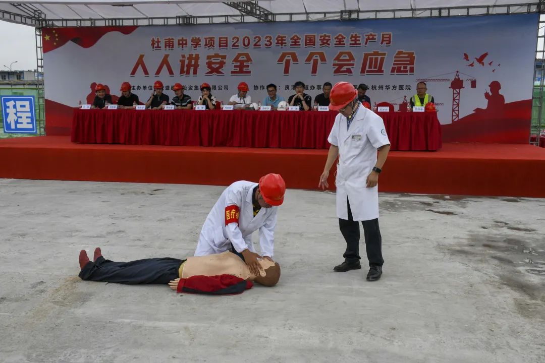 導讀:時值夏季,持續(xù)的高溫天氣給奮戰(zhàn)在一線的建筑工人帶來嚴峻考驗。為確保杜甫中學項目的安全生產工作順利開展,進一步提升全員應對突發(fā)事故的應變能力,6月20日,杜甫中學項目舉行事故應急救援演練,杭州良渚新城城建投資有限公司項目負責人凌錦華、杭州城投良渚新城開發(fā)有限公司項目負責人李洋、浙江嘉宇工程管理有限公司總監(jiān)理工程師楊國盛、良渚區(qū)域微型消防站站長鄧成勇、杭州華方醫(yī)院院長、主任醫(yī)師吳學華出席演練活動,集團副董事長、總裁周金旺,監(jiān)事長、審計中心總經(jīng)理成承等核心高管代表一同出席,各參會代表與項目各方代表一同