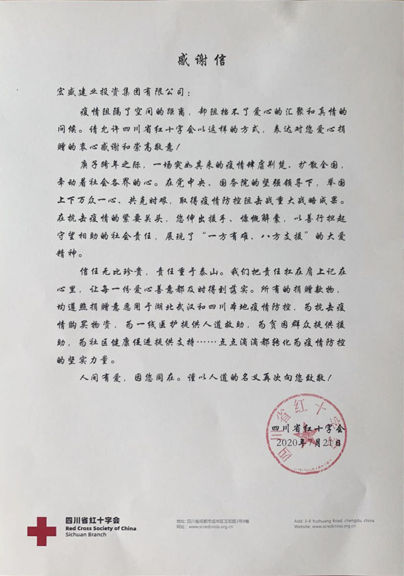 近日,為表彰宏盛建業(yè)集團(tuán)在防疫工作中的突出貢獻(xiàn),四川省紅十字會(huì)授予集團(tuán)“新冠肺炎疫情防控最具愛(ài)心企業(yè)”榮譽(yù)稱號(hào)。