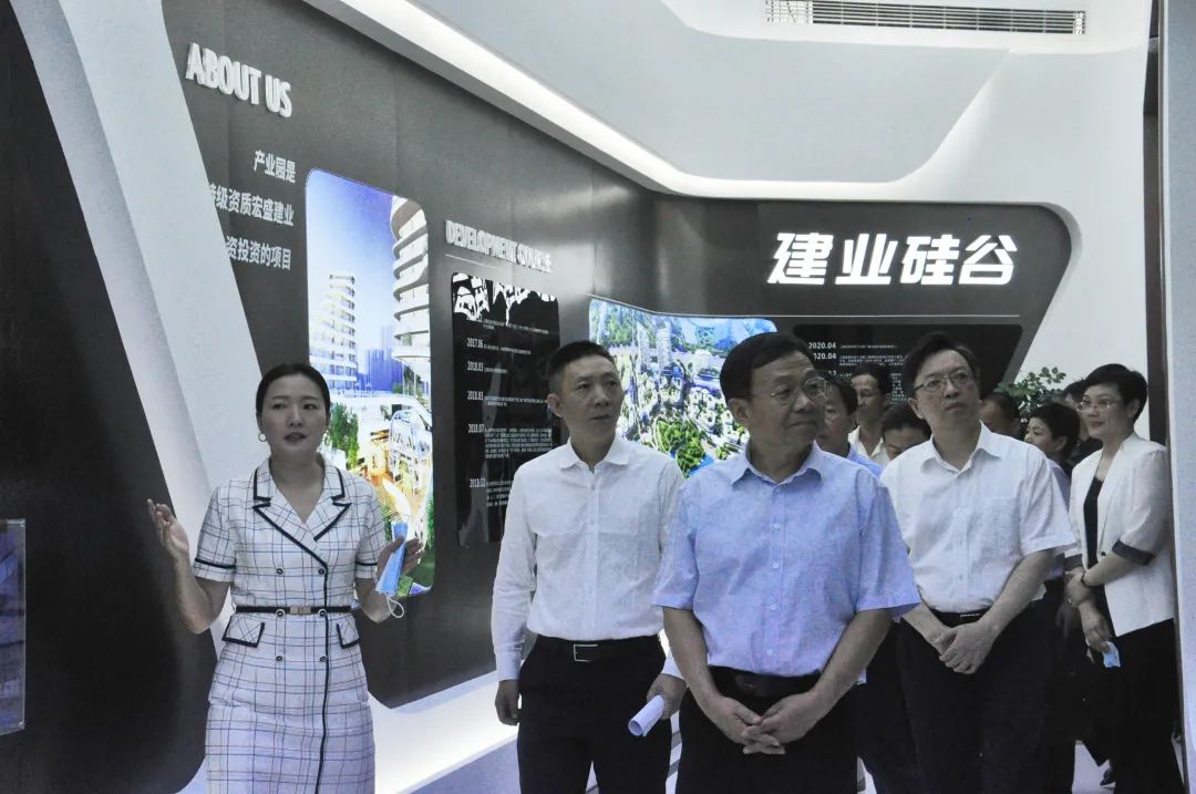 在建業(yè)硅谷總部經(jīng)濟(jì)園展廳,上饒市建筑科技產(chǎn)業(yè)園投資管理有限公司董事長(zhǎng)周金虎,向劉強(qiáng)主席簡(jiǎn)要匯報(bào)了建筑科技產(chǎn)業(yè)園項(xiàng)目自落戶(hù)上饒以來(lái)得到的政府支持以及所取得的成績(jī),并陪同觀看了宣傳視頻和展墻上相關(guān)板塊的介紹。