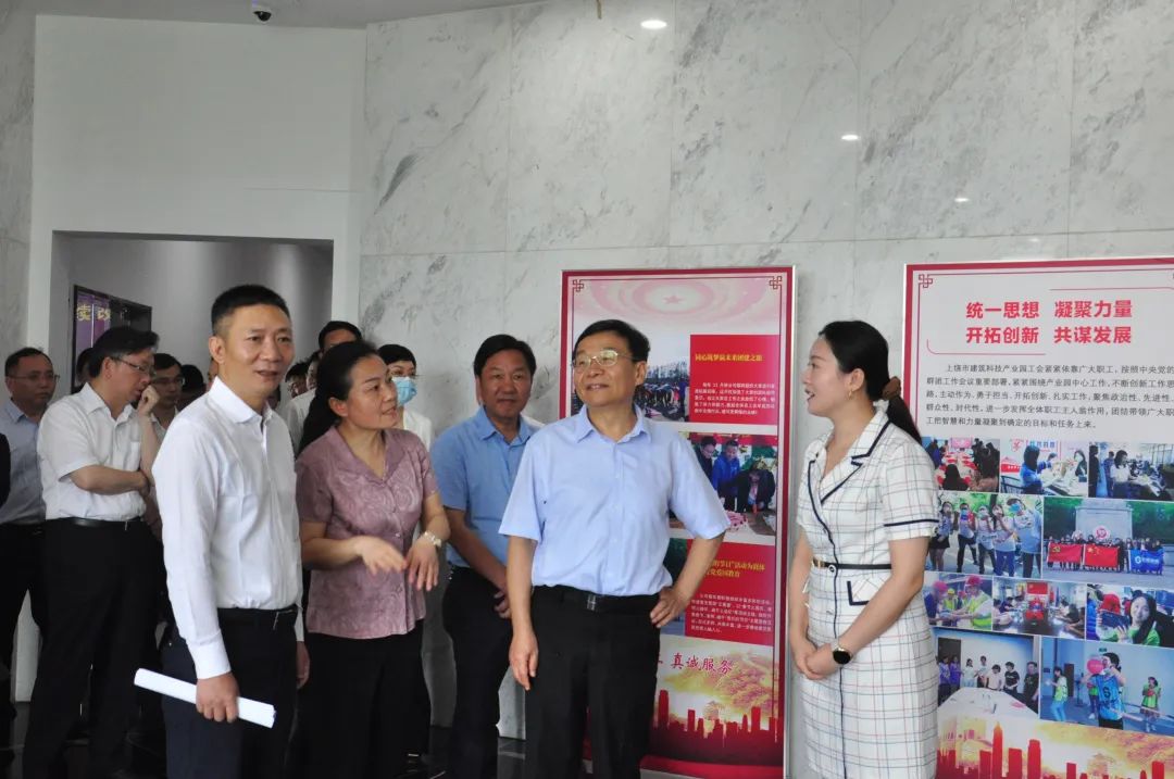 2022年7月5日上午,江西省人大常委會(huì)黨組副書(shū)記、副主任,省總工會(huì)主席劉強(qiáng)一行,在省總工會(huì)黨組書(shū)記、常務(wù)副主席鄒紹輝、上饒市委副書(shū)記郭素芳、上饒市人大常委會(huì)副主任,市總工會(huì)黨組書(shū)記、主席吳曙、上饒高鐵經(jīng)濟(jì)試驗(yàn)區(qū)黨工委書(shū)記魏文攻等陪同下,深入上饒市建筑科技產(chǎn)業(yè)園(建業(yè)硅谷)調(diào)研。