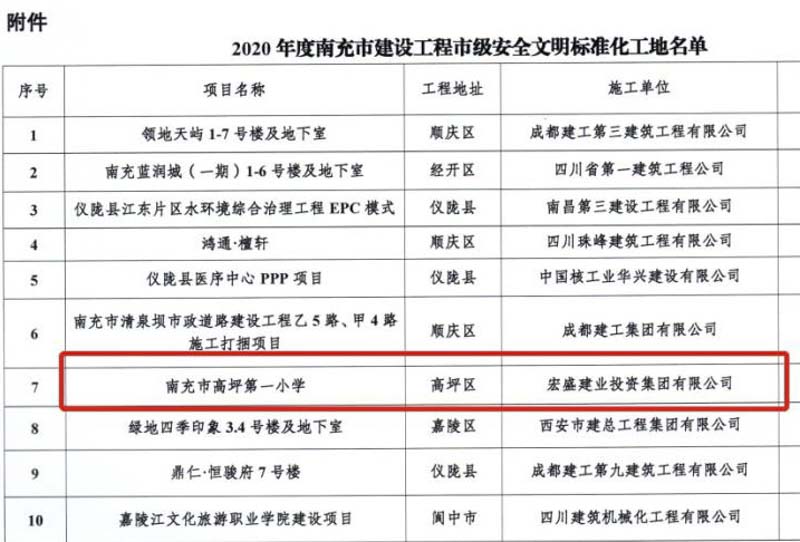 Guide:近日,從四川省南充市住房和城鄉(xiāng)建設(shè)局公布的《關(guān)于公布2020年度南充市建設(shè)工程市級(jí)安全標(biāo)準(zhǔn)化工地的通知》文件獲悉,宏盛建業(yè)投資集團(tuán)“南充市高坪第一小學(xué)”建設(shè)項(xiàng)目獲評(píng)“2020年度南充市建設(shè)工程市級(jí)安全文明標(biāo)準(zhǔn)化工地”。
