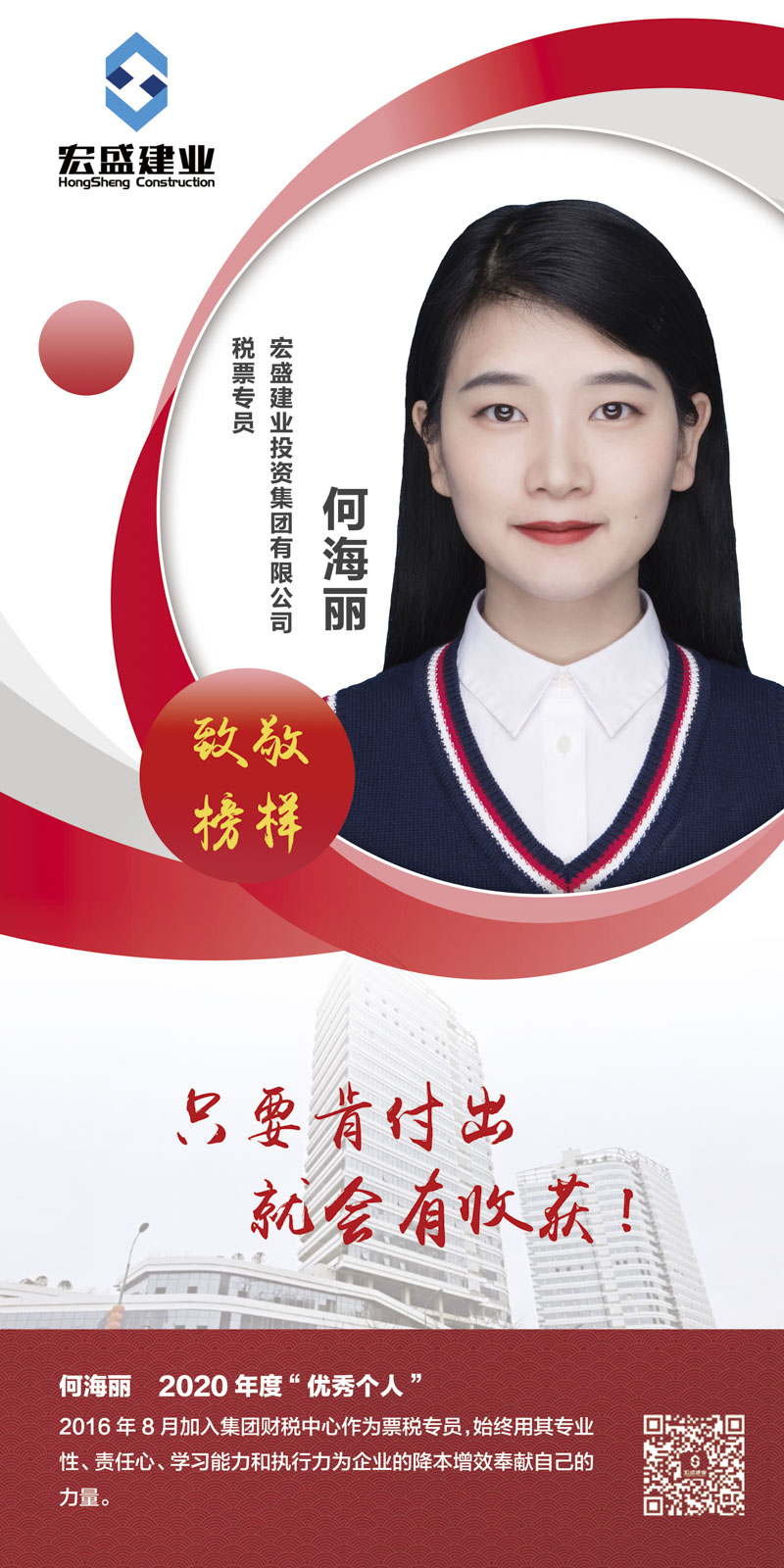Guide:2016年5月18日進入集團財稅中心擔任稅票專員,始終用其專業(yè)性、責任心、學習能力和執(zhí)行力為企業(yè)的降本增效奉獻自己的力量。 何海麗,一位集美貌和才華于一身的女子,同事們都愛稱她叫“何美麗”。自2016年5月加入宏盛建業(yè)財稅中心擔任稅票專員以來,她踏實肯干、兢兢業(yè)業(yè),始終認真履行崗位職責,時時刻刻都踐行著“認真、高效、堅守承諾”的工作作風,同時主動鉆研國家政策與企業(yè)戰(zhàn)略,不斷拓展自我、虛心求教,通過扎實學習業(yè)務知識,增強個人綜合素質,順利考取了國家二級建造師資格證書。
