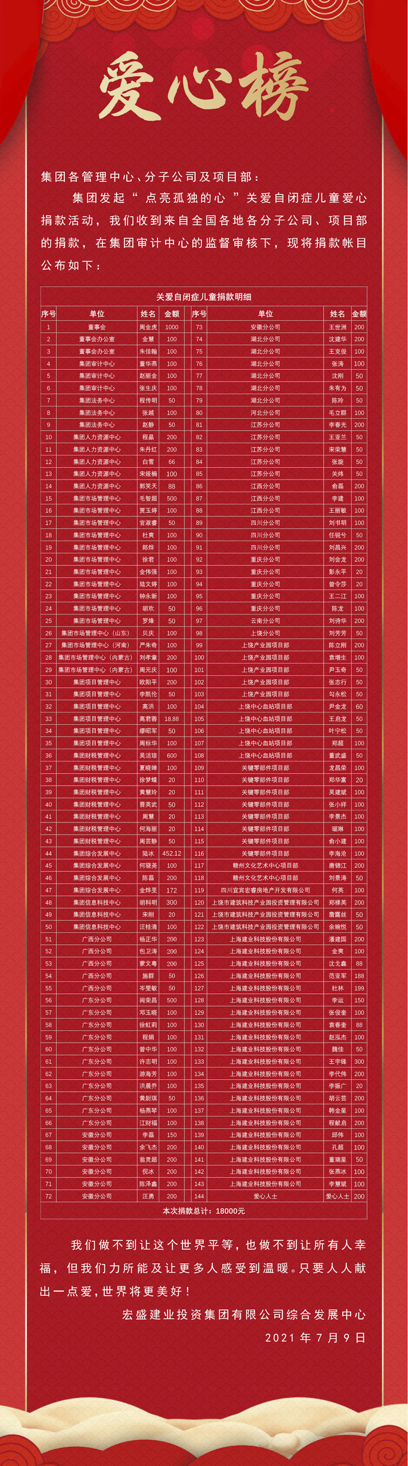 同時,宏盛集團發(fā)起全集團捐款活動,我們收到全國各地分子公司、項目部的愛心捐款,大家紛紛慷慨解囊,為這群特殊的孩子送去溫暖和祝福。宏盛集團和上海建業(yè)向上海市慈善基金會靜安區(qū)代表機構共計捐贈21000元,定向用于上海靜安越量兒童心智發(fā)展訓練中心教具項目。